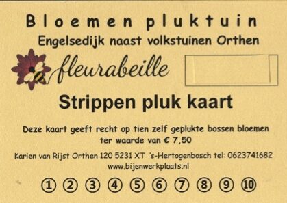 Met deze grote strippenkaart kun je 10 x een bos bloemen zelf knippen van 15 stelen. de kaart is 1 jaar geldig na datum van uitgifte.